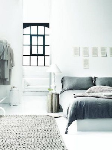 Cette chambre blanche joue sur des oppositions de couleurs délicates en associant notamment le blanc des murs à une déco grise. Le linge de lit et le tapis gris réveillent la déco lumineuse de cette chambre design. Le contour noir de la fenêtre aux formes esthétiques et modernes sublime la luminosité de la pièce en accentuant l’effet de contraste.