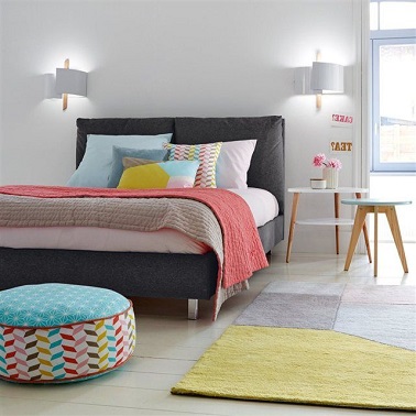 Pour donner du peps à une chambre trop blanche, rien n’est plus efficace que la couleur. En pouf, en linge de lit, en tapis ou même sur les petites tables d’appoint, couleur pastel et vives se mélangent pour réveiller toutes les décorations de chambre trop fades. Et pour surfer encore plus sur la tendance actuelle, on opte pour des motifs géométriques colorés ! Lit avec tête de lit et coussin TEYO 325,22 euros La Redoute