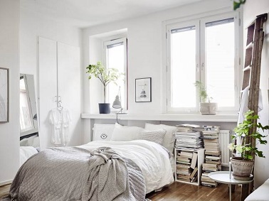 Une petite chambre blanche doit s’épurer au maximum pour garder de sa fraîcheur et rester agréable. Une petite table de chevet, un miroir pour donner de la profondeur et des plantes vertes, cette chambre mise sur un style simple et efficace qui rompt un total look blanc trop présent. Le parquet chêne doré réchauffe l’atmosphère de la pièce. A noter, les couleurs claires et lumineuses comme le blanc sont idéales pour donner du souffle à une chambre en manque de volume.