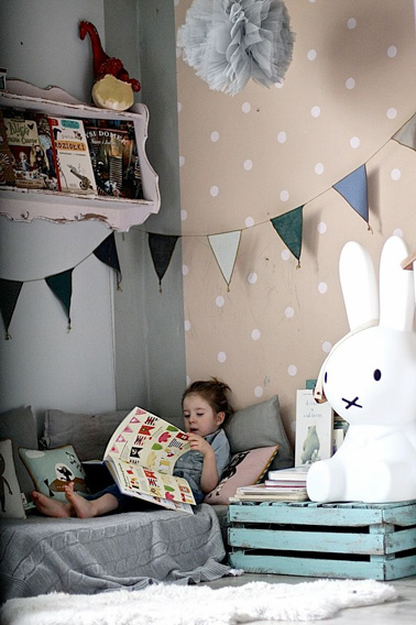 Une déco de chambre de petite fille idéale pour se relaxer et se détendre grâce à une peinture de couleur chaude sur les murs, décorés d’une guirlande drapeaux fabriquée par maman avec ses chutes de tissu. Le petit matelas au ras du sol en guise de canapé, le tapis à longs poils tout doux et la petite table de chevet réalisée à partir d’une caisse en bois peinte d’une jolie couleur confèrent à la chambre une atmosphère cosy. Une déco qui a du charme, pour les petites filles qui aiment se blottir dans leur nid douillet et s’évader dans la lecture.