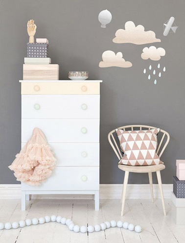 Une jolie chambre de petite fille aux couleurs douces pour une ambiance relaxante. Ici, le mur gris est adouci grâce à de petits dessins réalisés à la peinture beige clair et blac, une commode blanche décorée de jaune et des bibelots de couleur pastel . Le décor sobre est souligné par un beau parquet blanc. Une chambre élégante et féminine, décorée de petits nuages rappelant l’univers du rêve, qui ne manquera pas de faire craquer votre petite fille !