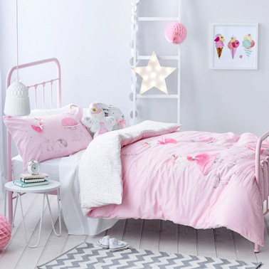 Une couette rose tendre dans une chambre de petite fille bleu ciel
