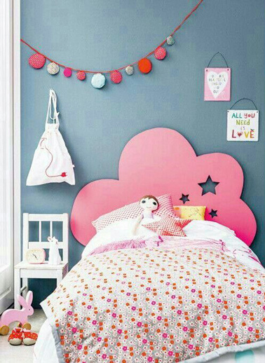Une belle tête de lit à réaliser avec du contre-plaqué et à peindre avec une jolie couleur rose princesse. Décorez-la de stickers étoiles et le tour est joué ! Une chambre originale agrémentée par une jolie déco : guirlande, petits cadres colorés, coussins et dessus de lit fleuri ! Une déco très girly pour une ambiance féerique et magique, qui plaira sans aucun doute aux petites filles !