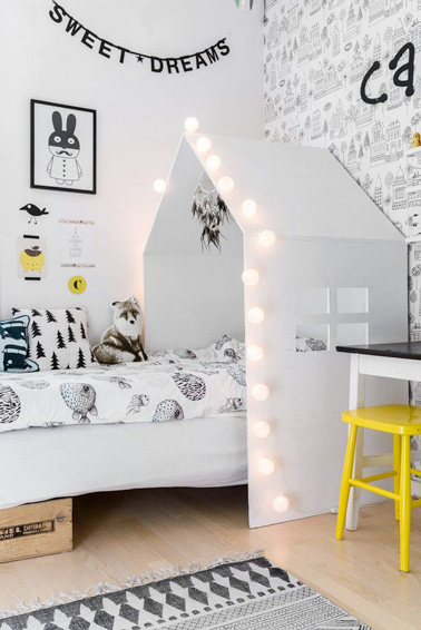 Un lit original dans cette chambre de petite fille toute blanche et grise ! Avec ses petites touches de jaune vif et son mur en papier peint, cette déco de chambre est ultra originale. Pour faire des rêves en couleurs, la tête de lit fabriquée par Papa prend la forme d’une petite maison en bois peinte en blanc et décorée d’une guirlande lumineuse pour une ambiance scintillante. Et on n’oublie surtout pas d’accrocher un attrape-rêve pour éloigner les vilains cauchemars !