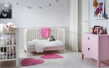 Même avec un lit à barreaux et une table à langer tous simples en bois blanc, on peut donner des touches girly à une chambre de bébé fille grâce à des touches de couleur rose. Un plaid rose et des tapis en forme de cœur spécial princesse et c’est gagné ! Tapis Hjärtlig, 64 x 67 cm, 5€ l’unité Ikea.
