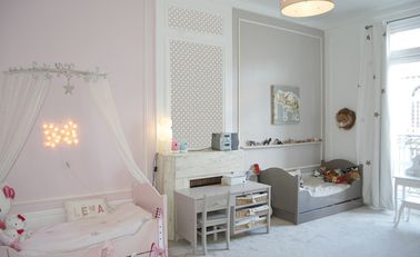 Difficile d’offrir une chambre de princesse à sa fillette quand elle doit partager la pièce avec son petit frère. Comment satisfaire les goûts des deux enfants sans gâcher la déco de la chambre ? Nanelle nous a donné de l’inspiration pour cette chambre mixte rose et grise. Côté fille, une peinture rose pale, un ciel de lit et une applique lumineuse en forme de papillon. Côté garçon, animaux et dinosaures coexistent dans une ambiance grise. Le mur central a été recouvert de papier peint gris et blanc qui fait penser à un dégradé de couleurs entre les deux espaces ! On retrouve un rappel du rose et du gris sur les rideaux étoilés côté petit frère.