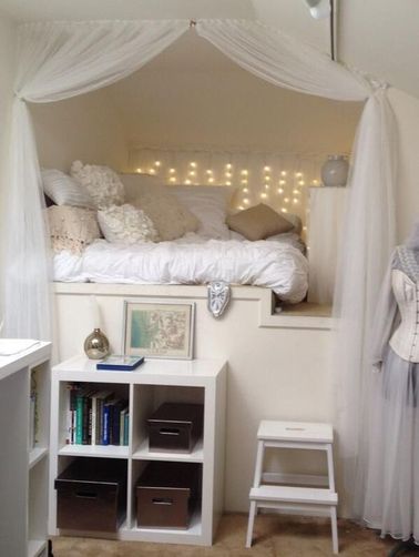Il ne suffit pas de grand-chose pour créer soi-même l’ambiance fastueuse de cette chambre qui ravira aussi bien les petites filles que nos ados ! La peinture, les coussins et les meubles blancs donnent un côté chambre reine des neiges à cette pièce dont on ne se lasse pas. Une tringle à rideau qui vient fermer l’alcôve offre de l’intimité et fait vraiment « lit de princesse ». La guirlande en LED fait penser à de petits flocons lumineux qui fignolent le look.