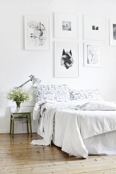 Quand simplicité des lignes et couleurs intemporelles se conjuguent dans la chambre cela donne une ambiance zen où il fait bon se relaxer. Ici, la décoration de la chambre en blanc et gris mise sur la subtilité des matières pour créer une ambiance douillette. Point de meubles, seules, une petite table et une chaise blanche font office de tables de chevet et encadrent un lit confortable autour d’un parquet blanc. Le dessus de lit en coton blanc cassé s’anime d’un jeu de coussins dans un dégradé de blanc et gris clair. Un coussin gris anthracite joue les intrus pour apporter un discret contraste. Le grand poster au dessus du lit amène une note de fantaisie.