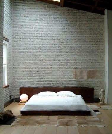 Une déco de chambre minimaliste dans laquelle se mélangent l’aspect brut du mur en pierres de parement et la chaleur du mobilier en bois. Le sommier au raz du sol est dans le pur esprit d’une chambre japonaise, une grande pièce de bois de rose forme la tête de lit et la couette de lit d’un blanc immaculé renvoie généreusement la richesse des matériaux qui l’entourent.