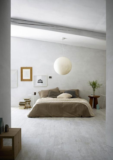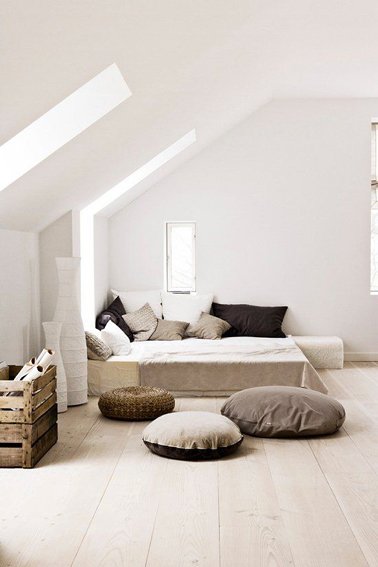 Ici, la chambre d’un loft où le parti pris des couleurs et matières naturelles est le fil conducteur. Parquet, coussins de sol , draps et jeté de lit de couleur taupe et lin se marient au blanc nuancé des murs. En restant dans la même gamme de tons, les touches de chocolat apportent un contraste très chaleureux à cette chambre baignée de douceur.