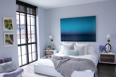 Le secret déco de cette chambre bleu ? Des couleurs lumineuses qui s’inscrivent dans des tons subtils entre bleu clair un tantinet lavande, blanc et gris pastel que subliment les touches de parme et de violet introduites par le fauteuil. Le plaid gris pastel tempère, pour mieux le mettre en valeur, l’intensité du tableau bleu vif qui donne tout son caractère à la chambre. Le parquet et les façades des chevets en bois couleur wengé relèvent l’impression de zénitude dans cette chambre sereine.
