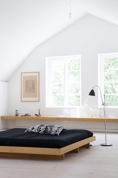 Pour la déco de cette chambre zen, juste un grand lit en chêne clair placé au centre de la pièce et recouvert d’un dessus de lit noir pour contraster avec la pureté du blanc des murs. L’étagère en chêne clair sous les fenêtres qui file tout au long du mur invite une collection de vases en verre pour leur effet lumière. Une déco sobre pour une ambiance sereine.