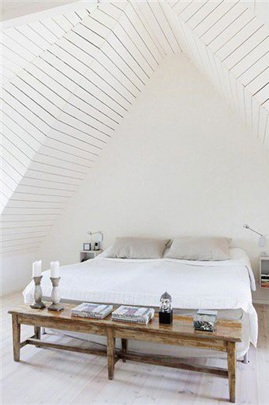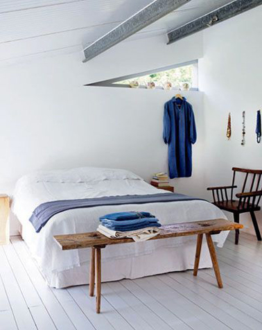 Un parquet peint en blanc comme les murs, des touches de bleu amenées avec quelques pièces le linge dans une petite chambre de maison de bord de mer. Les meubles en bois se limitent au minimum tout en apportant une note chaleureuse à cette ambiance minimaliste.
