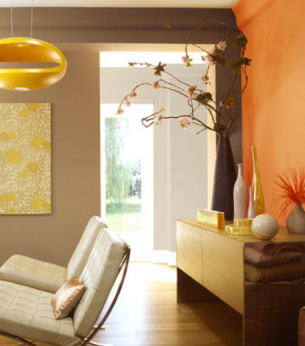 Si les murs de votre salon sont dans une couleur de peinture neutre, n’hésitez pas à choisir une teinte chaude, comme l’orange par exemple, une teinte lumineuse et dynamisante qui réveille les couleurs qui l’entourent. (évitez l’orange acidulé, optez plutôt pour un orange ocré plus doux pour le salon.