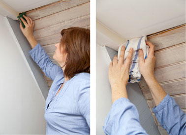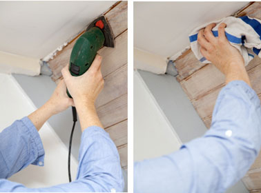 La mousse expansive bien sèche, poncez les excédents de mousse qui forment des petits bourrelets dans l’ancienne fente. Avec une ponceuse électrique l’opération est ultra rapide, mais rassurez-vous si vous n’en avez pas sous la main, le papier de verre convient parfaitement ! Essuyez  ensuite la surface à l’aide d’un chiffon sec afin de préparer la dernière étape.