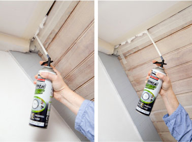 Les choses sérieuses commencent pour la vilaine fente du plafond source de la déperdition de chaleur dans la pièce ! les surfaces étant maintenant propres et protégées, vous pouvez appliquer la mousse expansive en actionnant la gâchette si possible avec une pression constante de manière à avoir un jet de mousse régulier. Lors du remplissage de la fente, prenez en compte que le volume de la mousse augmente de 2 à 2,5 fois lors du séchage, ( d’où le nom de cette mousse d’isolation ! ) donc ne comblez pas entièrement le trou à boucher.