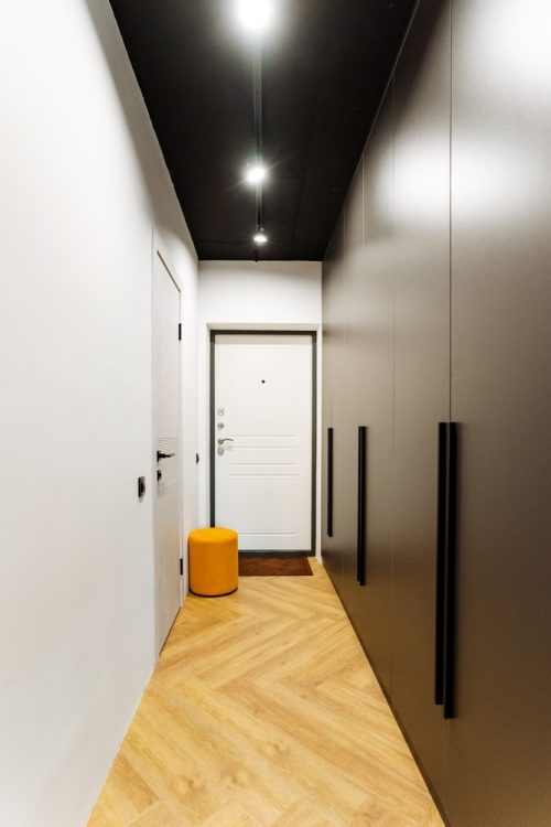 Une entrée sombre et étroite manque souvent de lumière naturelle. L’objectif est donc de réfléchir la lumière pour donner l’illusion d’un espace plus vaste et plus clair.