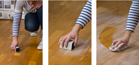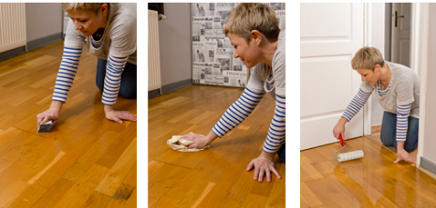 1 la préparation du parquet : Egrener le parquet à l’aide d’une cale à poncer et d’un papier abrasif grain 120 gr puis dépoussiérer le sol à l’aspirateur et terminer en avec un chiffon humide pour ôter toutes les particules de vernis ancien. Petit rappel : Egrener ce n’est pas poncer ! l’égrenage d’un support bois ou stratifié est un ponçage en surface, il n’est pas question de mettre le parquet à blanc avant d’appliquer le vitrificateur. Par contre égrener est indispensable garantir une bonne adhérence de la vitrification à venir.