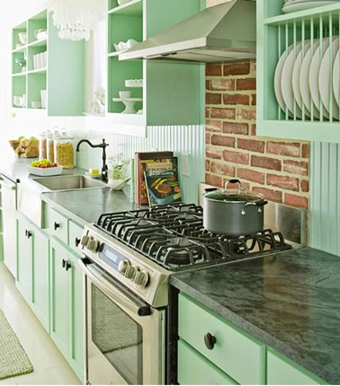 Meubles de cuisine peint couleur vert d'eau aspect satin, plan de travail marbre vert forêt, crédence en briques rouges