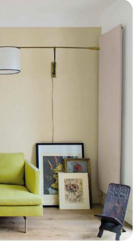 Canapé couleur vert d’eau. Peinture murale couleur Tatami. Peinture radiateur couleur Incognito de chez Tolens