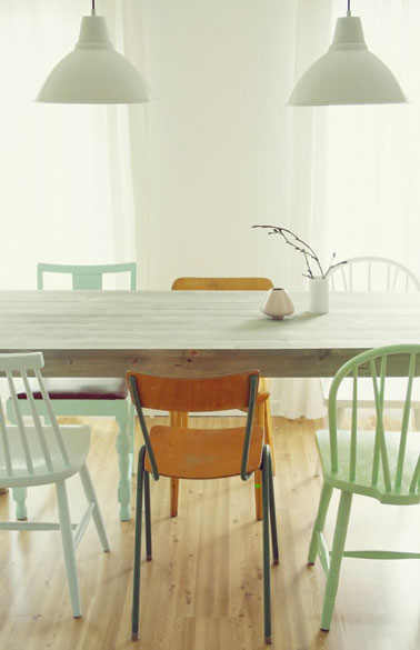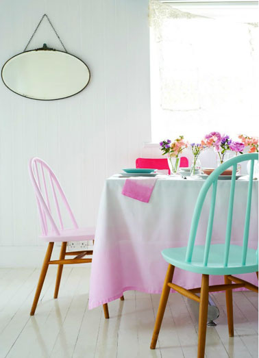 Dans cette cuisine, une cloison et un revêtement mural en altuglass vert d'eau et blanc fait les lien avec la salle à manger légèrement rosé et blanche. Une palette de couleurs tendres pour la déco d'une cuisine esprit maison de campagne.  Au dessus du carrelage blanc, le mur est repeint en gris perle, la table en bois a reçu un coup de peinture blanc cassé et les chaises de jardin repeintes en vert d'eau.Accueillante l'entrée de la maison avec une peinture vert d'eau sur les murs et gris clair sur la porte et les plinthes. Le porte manteaux fabriqué maison avec des tasseaux de bois est à craquer ! Une déco de salle à manger aménagée autour d'une belle couleur vert clair sur les murs, les chaises dépareillées et les 2 suspensions. Le parquet blond, ainsi que les 2 chaises laissées dans leur jus apportent la touche chaleureuse. Du vert et du blanc pour relooker une salle à manger dans un esprit récup. Autour de la table bois repeinte en blanc et ses pieds passés à la peinture en bombe noire, les chaises repeintes en vert printemps font écho au dessus du buffet. Il suffit parfois de pas grand chose pour égayer un salon gris. dans celui-ci la vieille commode est relookée avec du papier peint Liberty vert et on a ajouté un vert lumière avec le fauteuil en corde. La fraicheur des couleurs pastel pour la déco d'un salon. Aux murs, une peinture blanche nuancée de bleu, le vert jade de la petite armoire est repris dans le tissu à fleur vert et jaune des coussins et le tapis de sol.Ambiance printanière dans une salle à manger blanche apportée par les couleurs pastel utilisées pour repeindre l'assise et le dossier des chaises en bois et l’explosion des couleurs utilisées pour la décoration de la table.