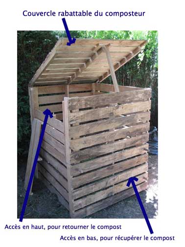 Après une découpe permettant d’accès au composte, pour que la partie haute soit amovible elle est fixée à l’aide de 2 tasseaux et de chevilles bois.