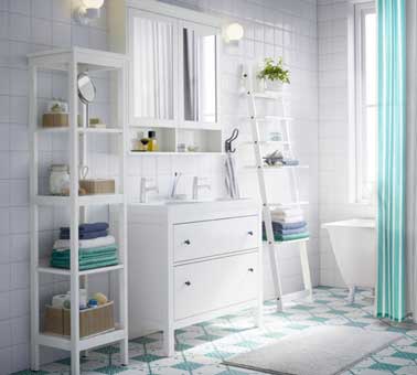 Meuble lavabo chêne blanchi avec 2 tiroirs de rangement GODMORGON / EDEBOVIKEN 259 € Étagère HEMNES coloris blanc 89 € Ikea