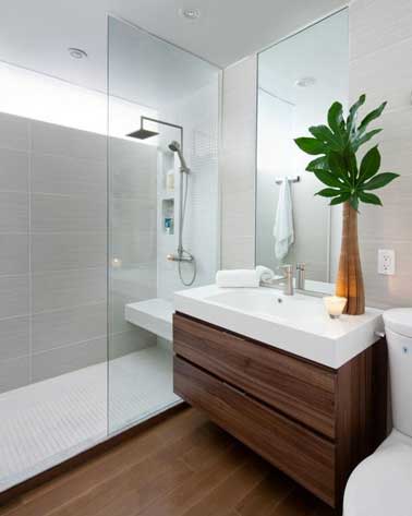 Jouer sur la couleur salle de bain, (celle des murs, du plafond, du sol, tout compte), ajuster l’éclairage qui a toute son importance dans une salle de bain aveugle (ce qui est souvent le cas en ville), ou encore adapter les rangements et les sanitaires de façon à fournir une impression de grandeur et de profondeur sont des actions efficaces.