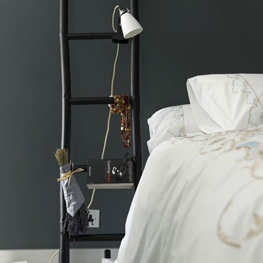 table de nuit dans chambre noir et blanc réalisée à partir d'une échelle en bois peinte en noir satin. Le spot de lumière est accroché sur une barre de l'échelle.Pour rompre l’aspect monochrome de cette chambre gris anthracite et blanc, une idée déco originale de détournement d’objet avec cette échelle bois peinte en noir satin et fixée au mur qui fait office de table de nuit. Une touche d’humour qui casse la rigueur des couleurs, et les touches de doré et d’ambre des bijoux font échos aux broderies de fil doré du linge de lit.
