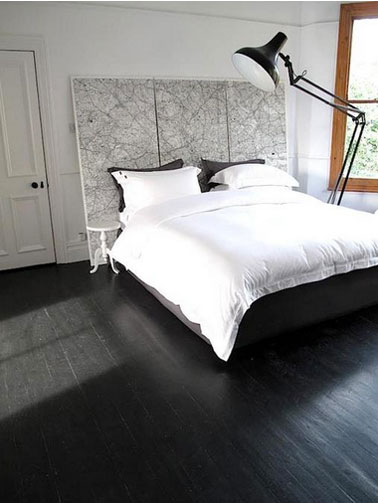 Nous avons retenu la déco de cette chambre pour sa tête de lit originale réalisée avec une grande carte routière en noir et blanc collée sur des panneaux de contreplaqué.