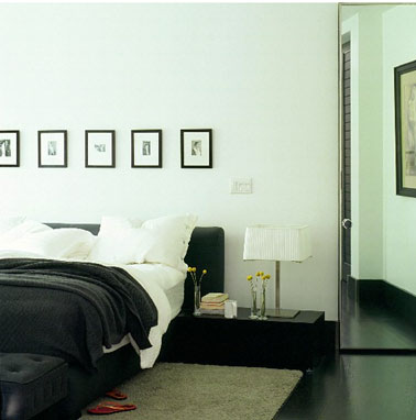Déco chambre en noir et blanc. Peinture murs blanc pur. sol peint en noir brillant, table de nuit noir laqué linge de lit noir et blanc. Dans cette chambre zen et contemporaine, le blanc et noir sont en parfaite équilibre. Au sol, le revêtement en frêne teinté en noir intense se prolonge avec les plinthes et apporte un contraste fort avec le blanc pur de la peinture murale. La table de nuit laquée noir brillant fait corps avec le sol, le bout de lit en cuir capitonné, la tête de  lit et le jeté de lit dans le même noir intense tranchent avec le blanc immaculé des draps de lit . Le tapis de laine ajoute une texture supplémentaire et l’horizontale formée par les petites photos encadrées de noir soulignent le jeu de lignes volontairement travaillé dans cette chambre. Les deux très discrets bouquets de fleurs ajoutent une note subtile à l’ensemble.