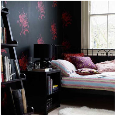 Le noir adore le rouge parce qu’il flatte son égo et sait le mettre en valeur ! Dans cette chambre d’ami où le noir est en masse, le thème des fleurs est là aussi repris avec le décor du papier peint et les coussins pour apporter douceur et intimité propices au repos.