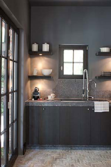 Voilà une teinte idéale pour refaire sa cuisine dans un style industriel sans changer de meubles. Une peinture gris anthracite sur le linéaire, une teinte gris béton pour repeindre les murs et la base du décor est plantée. Un mitigeur pro avec grand ressort flexible pour remplacer l’ancien et la cuisine est au top.