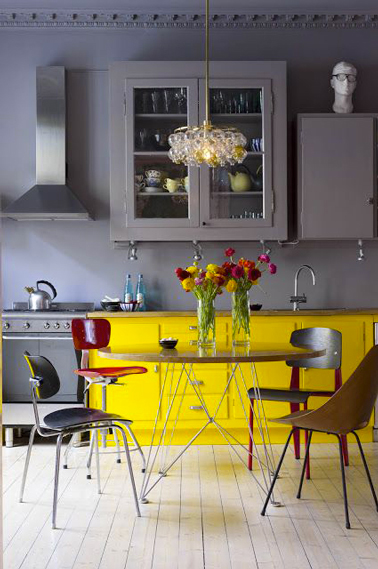 Une peinture jaune vif sur les meubles bas et la cuisine grise s’illumine !