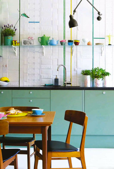 Vert, noir et blanc, un trio couleurs sympa pour la cuisine. Dans celle-ci c’est le vert émeraude qui a la vedette. Utilisé pour repeindre les meubles on le retrouve en fines lignes verticales pour créer une composition graphique sur la crédence en carrelage blanc. Avec cette couleur de peinture lumineuse pour les meubles, le plan de travail noir s’imposait presque, d’autant qu’il trouve un écho avec l’assise noir des chaises en bois.