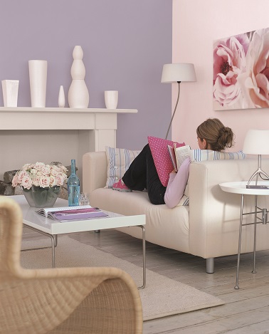 Pour envelopper la déco d’un petit salon de couleurs raffinées et féminines, une peinture couleur parme, rose poudré  se marient à merveille avec le mobilier alentour. Le canapé beige et la cheminée peinte en gris clair sont des éléments qui subliment et s’accordent parfaitement avec cette teinte de violet clair rafraîchissante très tendance.  Une ambiance sereine, douce et moderne, s’installe alors pour un véritable havre de paix, propice à la détente !