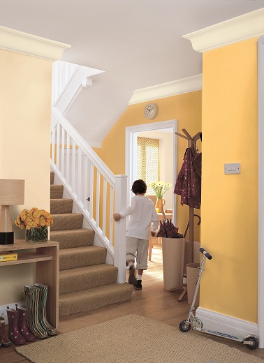 La peinture jaune tournesol fait rayonner  cette entrée ! De la vie et du soleil émanent de cette couleur vive. Pour contrebalancer l’effet trop pep’s de cette teinte, un mur peint en beige vient apaiser l’espace tout en conservant la clarté et la chaleur  de ces nuances naturelles. Une combinaison de couleurs à retenir pour éclaircir un couloir ou pour une l’entrée de la maison gaie et accueillante !