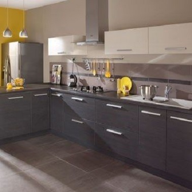 Une cuisine taupe avec des meubles gris anthracite et des touches de jaune pour égayer le tout, un accord parfait pour la déco des fourneaux !