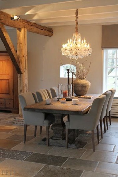 Du taupe dans une salle à manger, what else ? Le mur et les chaises taupe ainsi que le carrelage en nuance de la même couleur, offrent à cette pièce à vivre un aspect classe et chaleureux. La table et les poutres apparentes en bois se marient idéalement à cette déco taupe et amènent la touche conviviale. Une salle à manger style rustique chic douce et généreuse, grâce à la couleur taupe c’est possible ! Source : Pinterest