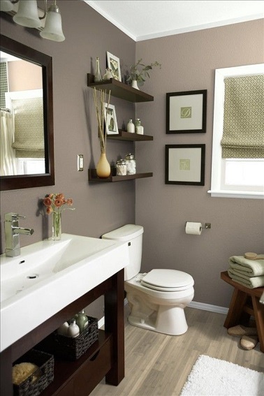 La couleur taupe investit aussi les murs de cette salle de bain. Bois foncé et blanc viennent relever l’ambiance de cette salle d’eau à l’ambiance très zen.