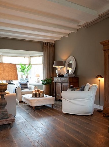 Convivialité et détente se dégagent de ce salon taupe. Assez bas de plafond, la pièce semble être comme un petit cocon très chaleureux entre bois et couleur chaude. Les meubles blancs captent la lumière émanant de la large baie vitrée du fond tandis que la couleur taupe des murs les met en valeur. Une déco élégante et confortable, le comble du luxe à domicile. Source : flickr.com