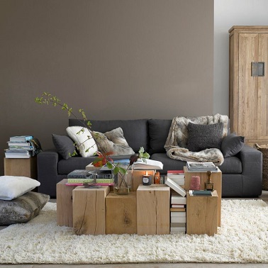 Un espace salon cosy grâce à la couleur taupe chaleureuse des murs renforcée par des nuances de couleurs dans les mêmes tons doux sur le canapé et au sol.
