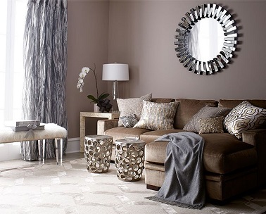 Du taupe sur les murs de ce salon au design tout en douceur. Le canapé chocolat s’inscrit harmonieusement dans la déco de cette pièce mixant lignes classiques et matériaux modernes pour mieux en affirmer les éléments forts. Contemporains, les deux petites tables d’appoint d’aspect argenté et le miroir en métal au côté du revêtement plus classique en velours frappé du canapé renforcent le caractère original et cosy de ce salon couleur taupe. Source : horchow.com