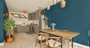 Les murs de cette cuisine grise ont été recouverts de peinture gris anthracite. La crédence en inox contre l’évier peut être proposée en format frise pas trop haute pour protéger des projections d’eau. Protection évier en inox, anti-traces, 49€, Leroy Merlin.