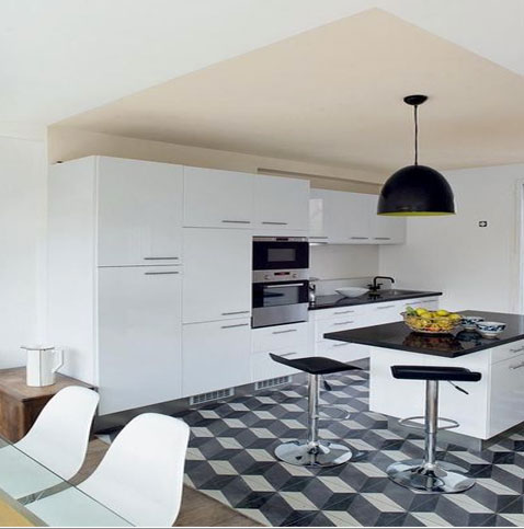 Dans une cuisine ouverte sur la salle à manger un mélange de styles très structuré. Aux lignes et couleurs pures des meubles et murs blancs, s’opposent le carrelage au sol avec ses effets 3D, le plan de travail en granit noir tandis que le plafond peint couleur lin fait le lien avec le style rétro de l’espace repas avec son  parquet de chêne et le coffre en bois ancien. Peinture Esprit libre de Tollens.