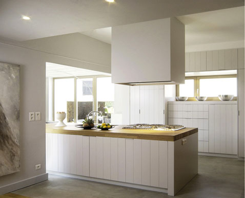 Dans cette cuisine zen aux volumes sublimes, une décoration donnant la priorité à la lumière et aux couleurs naturelles comme pour prolonger le jardin qui ne demande qu’à rentrer  par les grandes baies. L’îlot central et le meuble évier sont construits sur mesure en carreaux de plâtre et recouverts d’une peinture couleur lin pour faire une unité de couleurs avec celle des murs. Une cuisine où le superflu n’est pas invité pour mieux magnifier les couleurs naturelles et le superbe lustre. Le sol en travertin fait le lien avec l’espace salle à manger au plafond blanc.