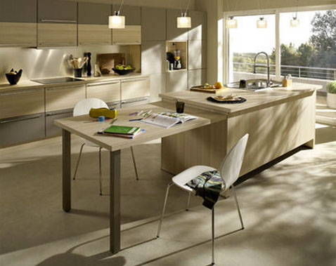 Une ambiance zen se crée avec tous les styles de cuisine.  Ici, la peinture couleur lin  des murs, en parfaite harmonie de ton sur ton avec les meubles en bois aux lignes contemporaines et le beige du carrelage au sol, est relevée par la peinture gris pastel des plinthes. La grande toile au mur qui fait le lien entre l’espace cuisine et celui du salon, joue les complices en reprenant la palette couleurs de la cuisine. Pour conserver aux meubles la pureté de ses lignes, les poignées de tiroirs et placards sont encastrées. Le plan de travail en chêne clair renforce l’atmosphère chaleureuse de la cuisine. Cuisine « Asia  » chez Cuisinella