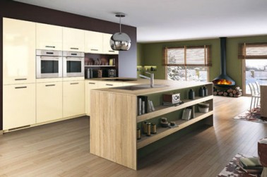 Quand la déco de la cuisine s’orchestre autour de matériaux et couleurs 100% nature nul doute qu’il y fait bon vivre et ce n’est pas le poêle à bois qui dira le contraire ! L’îlot central qui accueille l’évier, le lave vaisselle et les étagères de rangement en décor chêne clair, semblent sortir du sol parquet chêne clair et est mis en valeur par les deux linéaires de retour aux façades couleur ivoire. Sur le mur qui accueille le poêle à bois, une peinture vert bronze complète cette harmonie de couleurs naturelles pour une ambiance zen. Cuisine ‘Kiffa » Mobalpa.
