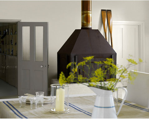 Résolument minimaliste la décoration de cette cuisine de style industriel s’articule autour du poêle de couleur charbon. Pour lui faire écho, la peinture murale entre couleur lin et gris taupe. Les rayures bleues de la nappe en lin et du pot à eau en zinc détourné en vase complètent joliment cette harmonie de couleurs zen. Peinture Astral.