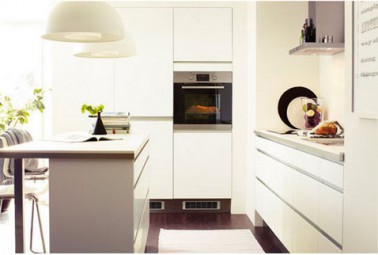 Des meubles de cuisine blanc ivoire, des larges suspensions couleur lin au dessus de l’îlot , des touches de gris taupe et de vert tendre, voilà le secret de cette cuisine qui profite en plus de la belle luminosité venue du salon. Un parquet flottant finition wengé délimite l’espace réservé à la cuisine et accentue l’effet lumière des meubles. Cuisine Ikéa